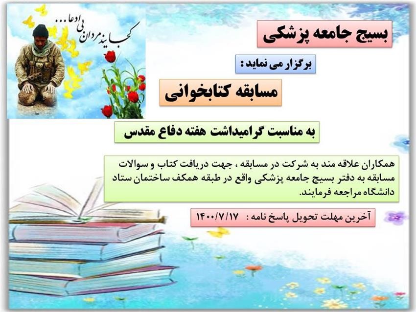 اطلاعیه برگزاری مسابقه کتابخوانی به مناسبت گرامیداشت هفته دفاع مقدس ۲۹ شهریور ۱۴۰۰ | ۱۱:۲۴ کد : ۲۰۲۹۴ اطلاعیه ارسال به دیگران نام شما ایمیل شما ایمیل دریافتکننده ارسال انصراف تعداد بازدید:۲۷۴۵۶