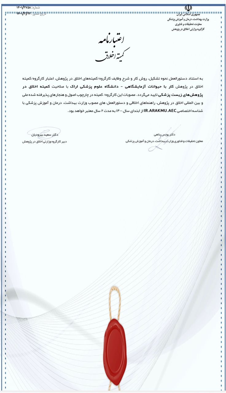 اخذ اعتبار نامه کمیته اخلاق در پژوهش کار با حیوانات آزمایشگاهی برای دانشگاه علوم پزشکی اراک ۰۱ تیر ۱۴۰۱ | ۰۷:۲۲ کد : ۲۷۲۴۶ اطلاعیه ارسال به دیگران نام شما ایمیل شما ایمیل دریافتکننده ارسال انصراف تعداد بازدید:۱۸۲۲۳