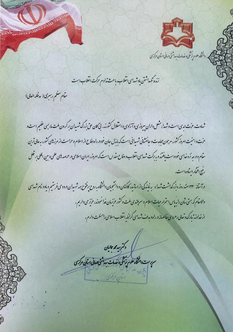 متن تقدیرنامه سرپرست دانشگاه برای بزرگداشت شهدا ۰۷ اسفند ۱۳۹۷ | ۱۳:۰۰ کد : ۳۰۱۸ اصلی ارسال به دیگران نام شما ایمیل شما ایمیل دریافتکننده ارسال انصراف تعداد بازدید:۴۷۲۷۹