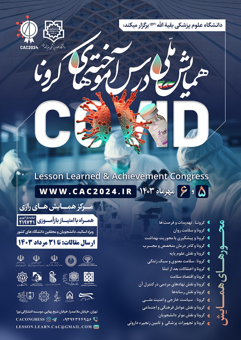 همایش ملی درس آموخته های  کرونا در تاریخ ۵ و ۶ مهرماه ۱۴۰۳ در سالن همایش های رازی تهران ، توسط دانشگاه علوم پزشکی بقیه الله(عج) ، برگزار خواهد شد. این همایش ضمن ارائه و نشر تجربیات و درس آموخته های ارزشمند اساتید ، محققین و دانشجویان در حوزه کرونا در قالب مقالات و برگزاری پنل ها و سخنرانی ها، نسبت به اجرای  جشنواره فرهنگی و هنری با ارائه آثار (عکس، نقاشی، فیلم مستند، شعر ، موسیقی و ...) ، رویداد ایده و فن بازار مرتبط به بیماری کرونا، اقدام خواهد نمود.