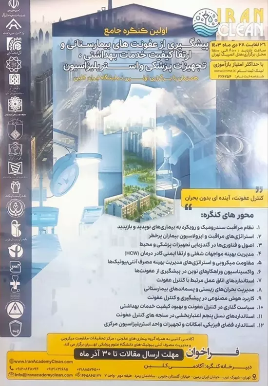 اولین کنگره جامع پیشگیری از عفونت های بیمارستانی و ارتقا کیفیت خدمات بهداشتی، تجهیزات پزشکی و استریلیزاسیون همزمان با برگزاری اولین نمایشگاه ایران کلین که توسط گروه بیماری های عفونی و مرکز تحقیقات مقاومت میکروبی و مدیریت مصرف آنتی بیوتیک ها 26 لغایت 28 دی ماه 1403 در هتل المپیک تهران برگزار خواهد شد.
