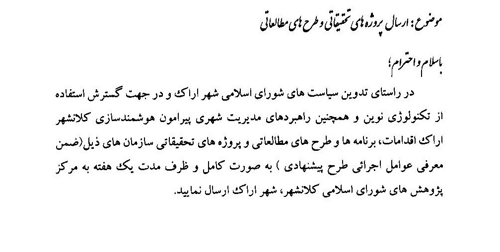 شورای اسلامی شهر اراک در خصوص ارسال پروژه های تحقیقاتی و طرح های مطالعاتی به شرح ذیل اطلاع رسانی نموده است.
