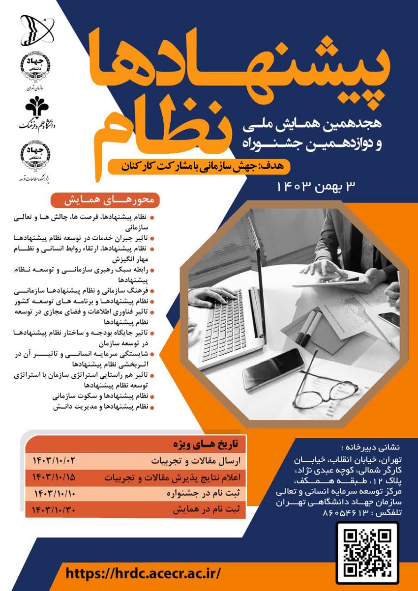 سازمان جهاد دانشگاهی تهران در نظر دارد با همکاری دانشگاه ها و مراکز علمی تحقیقاتی، سازمان ها و دستگاه های اجرایی دولتی و خصوصی «هجدهمین همایش ملی و دوازدهمین جشنواره نظام پیشنهادها» را با هدف " توسعه نظام پیشنهادها و تحقق جهش سازمانی با مشارکت منابع انسانی " در بهمن ماه سال جاری برگزار نمایند.