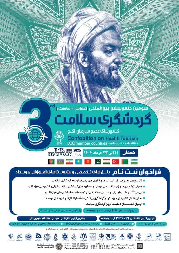 به اطلاع می رساند استان همدان از تاریخ ۲۱ لغایت ۲۴ خردادماه میزبان سومین کنفوبیشن (کنفرانس + نمایشگاه) بین المللی گردشگری سلامت کشورهای عضو سازمان اکو می باشد و از هر کشور عضو اکو، هیئتی مشتمل بر عالی ترین مقامات درمان و سلامت + گردشگری، فعالان بلند پایه پزشکی و گردشگری، مدیران تشکل های گردشگری و درمان و گروههای بخش خصوصی تجاری و اقتصادی و همچنین سفیر هر کشور مستقر در تهران همراه با رایزن اقتصادی سفارت، میزبان این رویداد می باشند. برگزاری با شکوه و حضور پرشور مجموعه های فعال در حوزه های متنوع گردشگری سلامت سراسر کشور در این رویداد بین المللی، ضمن معرفی ظرفیت ها  و توانمندی های تخصصی حوزه های گردشگری سلامت و تندرستی همه استان های کشور، زمینه تبادلات تجاری و  اقتصادی اعم از صادرات، جذب سرمایه گذاری و ارز آوری خواهد بود.