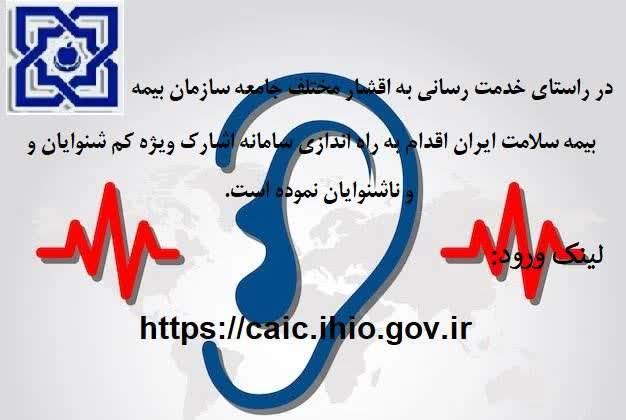 سازمان بیمه سلامت ایران، در راستای خدمت رسانی شایسته، اقدام به راه اندازی سامانه «اشارک» ویژه کم شنوایان و ناشنوایان، با آدرس اینترنتی https://caic.ihio.gov.ir نموده است.