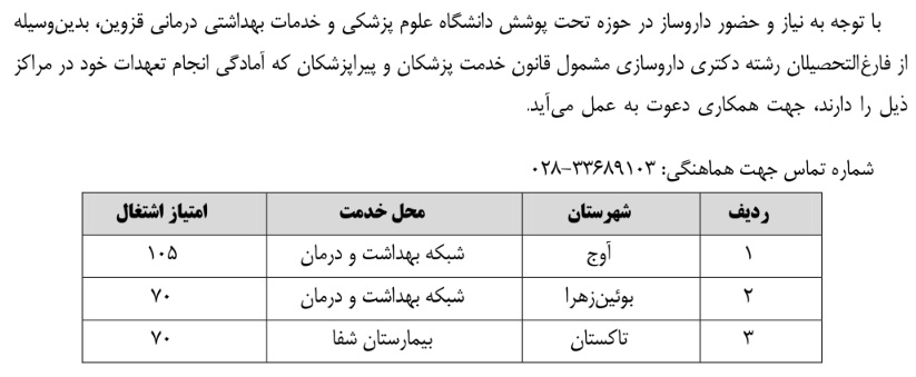 جذب نیروی داروساز مشمول قانون خدمت ۲۵ آذر ۱۴۰۴ | ۰۹:۰۰ کد : ۵۷۰۵۷ اطلاعیه ارسال به دیگران نام شما ایمیل شما ایمیل دریافتکننده ارسال انصراف تعداد بازدید:۱۷۸۷ جذب نیروی داروساز مشمول قانون خدمت در دانشگاه علوم پزشکی قزوین