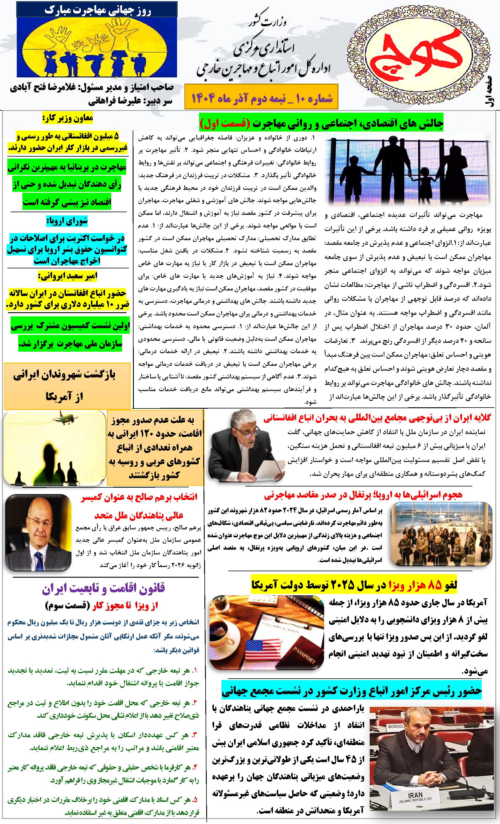 دهمین شماره نشریه کوچ ۰۳ دی ۱۴۰۴ | ۰۹:۲۱ کد : ۵۷۵۲۰ اطلاعیه ارسال به دیگران نام شما ایمیل شما ایمیل دریافتکننده ارسال انصراف تعداد بازدید:۴۷ دهممین شماره نشریه کوچ، توسط دفتر امور اتباع و مهاجرین خارجی استان مرکزی منتشر گردید.