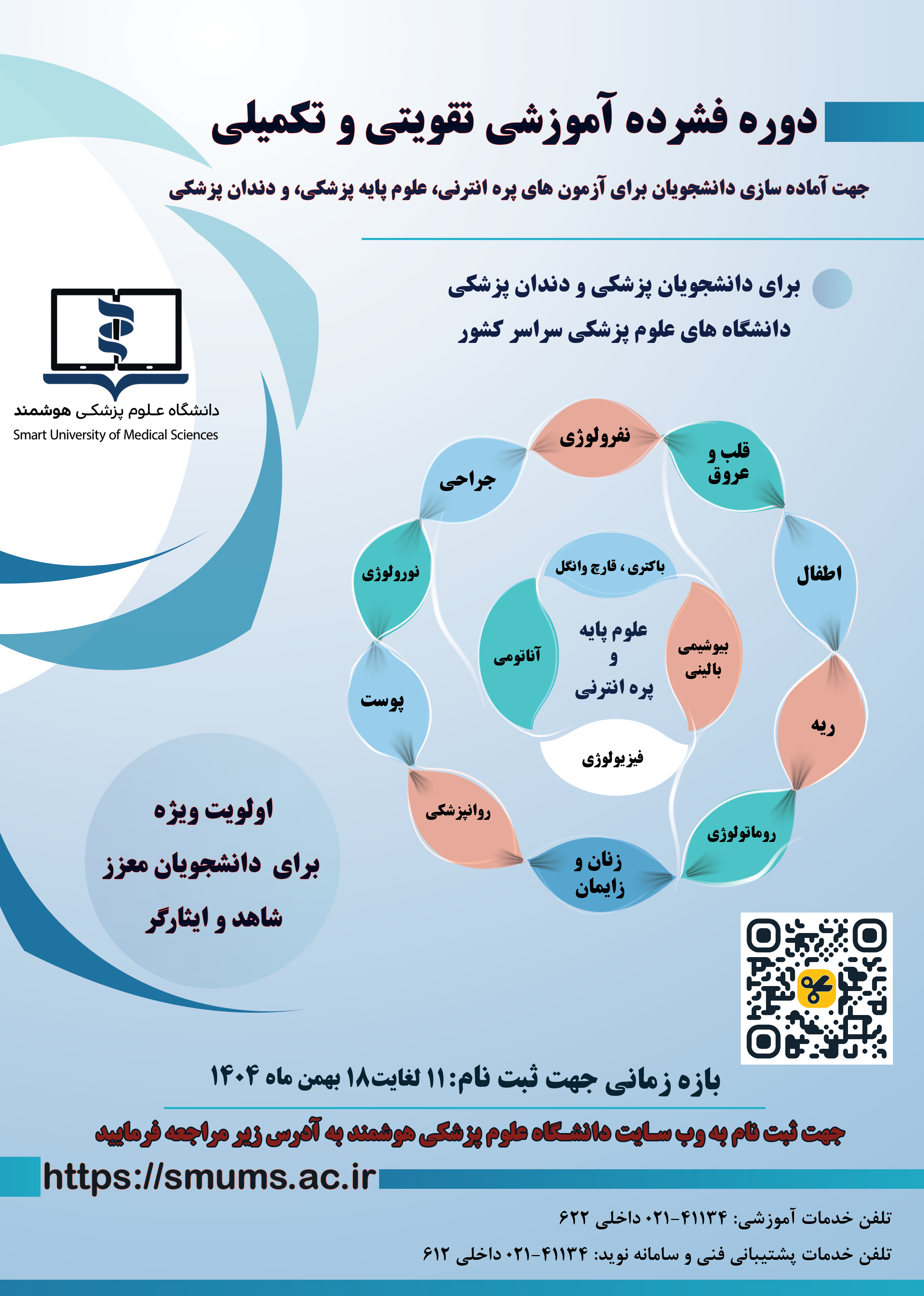 به اطلاع می رساند، دانشگاه علوم پزشکی هوشمند، ششمین دوره برنامه فشرده تقویتی - تکمیلی را جهت آماده سازی کلیه دانشجویان دکتری عمومی پزشکی و دندان پزشکی  (دانشجویان عادی و دانشجویان شاهد و ایثارگر) برای آمادگی آزمون های جامع برگزار می نماید.