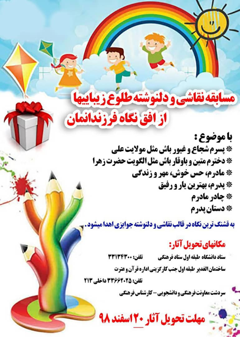 مسابقه نقاشی و دلنوشته طلوع زیبایی ها از افق نگاه فرزندانمان ۱۰ اسفند ۱۳۹۸ | ۰۹:۰۰ کد : ۷۸۷۰ اطلاعیه ارسال به دیگران نام شما ایمیل شما ایمیل دریافتکننده ارسال انصراف تعداد بازدید:۴۰۰۴۶